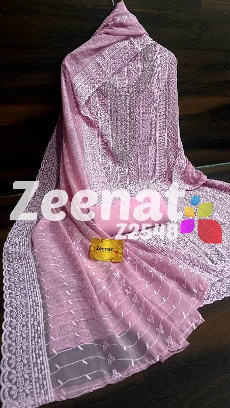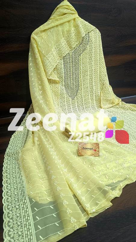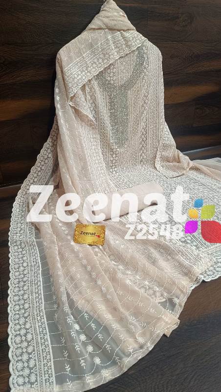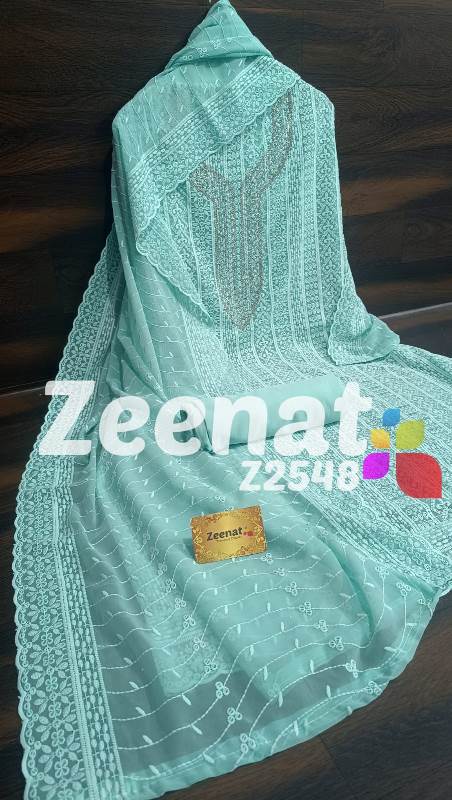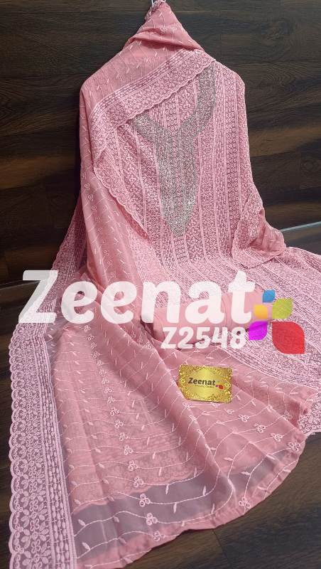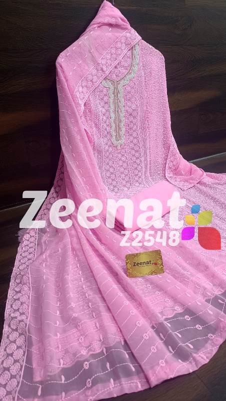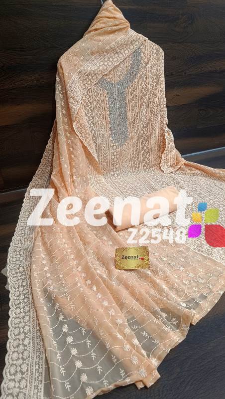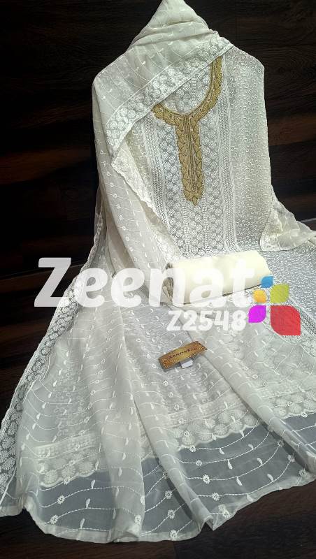 • NEW UPDATE Z2548 DESIGNER PC Details ?Shirt jorjet beautifull Lucknowi embroidery allover with hand neck work semi stich designer piece...back plain ?Bust 52 ?Length 46 ?Bottom inner dull shantoon fabric 4 M ?Dupatta jorjet with beautifull embroidery Very Very beautiful n exclusive design from ZEENAT ??? Quality ZEENAT Assured ?? Rate :: 1200 including shipping