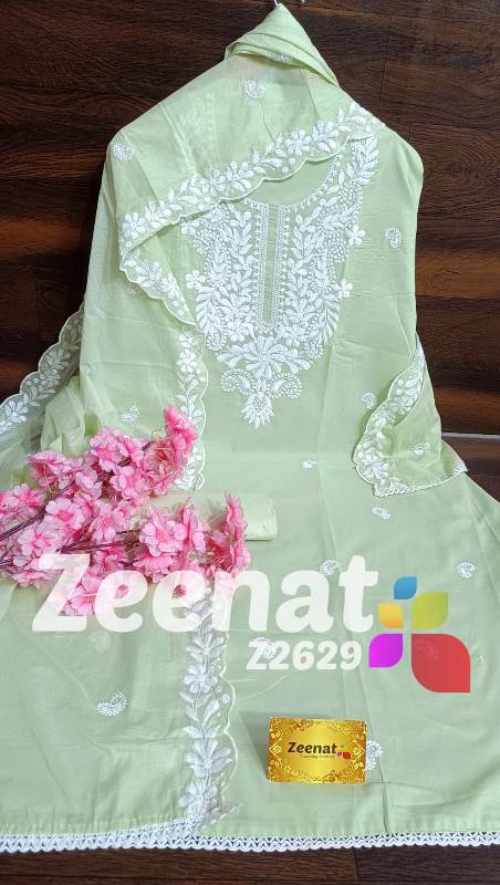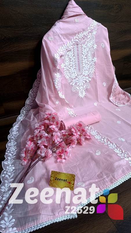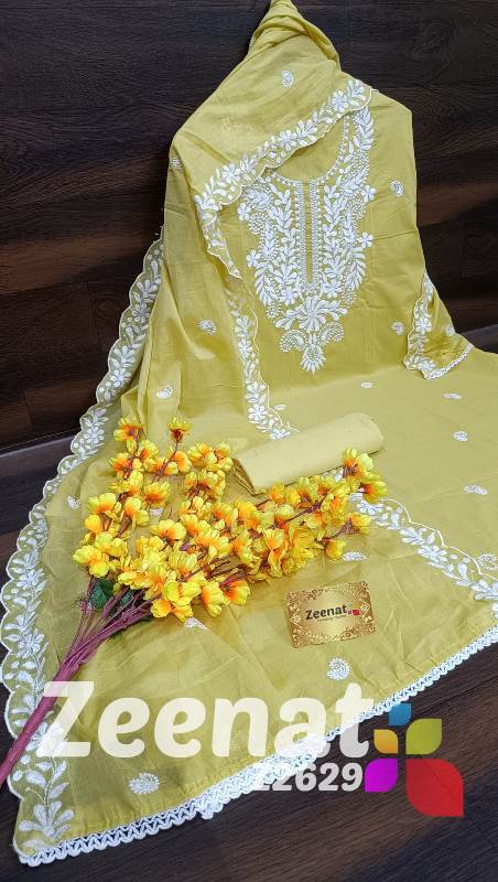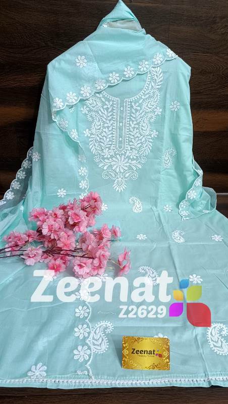 • NEW UPDATE Z2629 DESIGNER PC ? Top cotton semi-stitched with beautiful neck embroidery work...Bust 54 Length 46 ? Bottom cotton.....2.5 mtr approx ? Dupatta cotton with beautiful embroidery n border embroidery cut kwork..2.25 mtr approx Very Very beautiful n exclusive design from ZEENAT ? ? Quality ZEENAT Assured ? ? 1400 including shipping