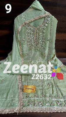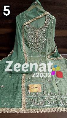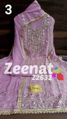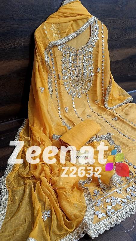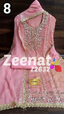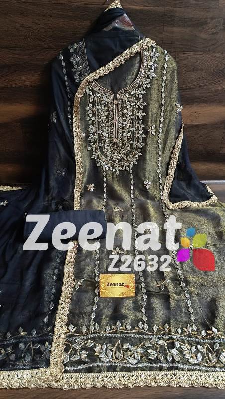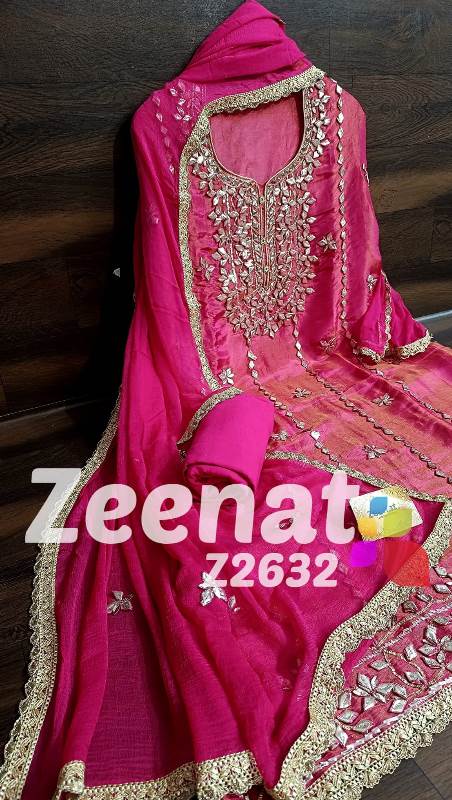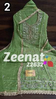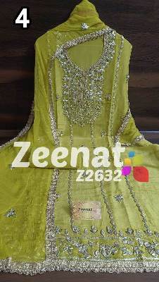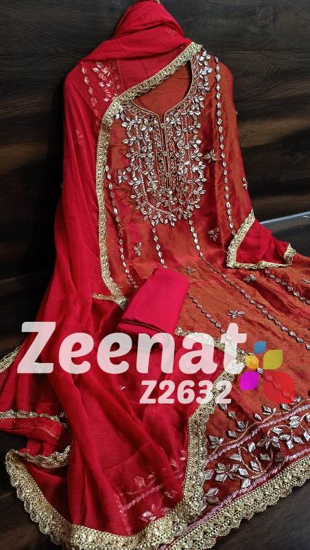 • NEW UPDATE Z2632 DESIGNER PC BRIDAL ? Top shimar unstitched with beautiful heavy gota work....daman gota lace....Length 46 bust 58 ? Bottom Shantoon....2.50 mtr apprx ? Duppata chifon with gota work n gota lace....2.25 mtr approx Very Very beautiful n exclusive design from ZEENAT ? ? Super quality ? ? 2000 including shipping
