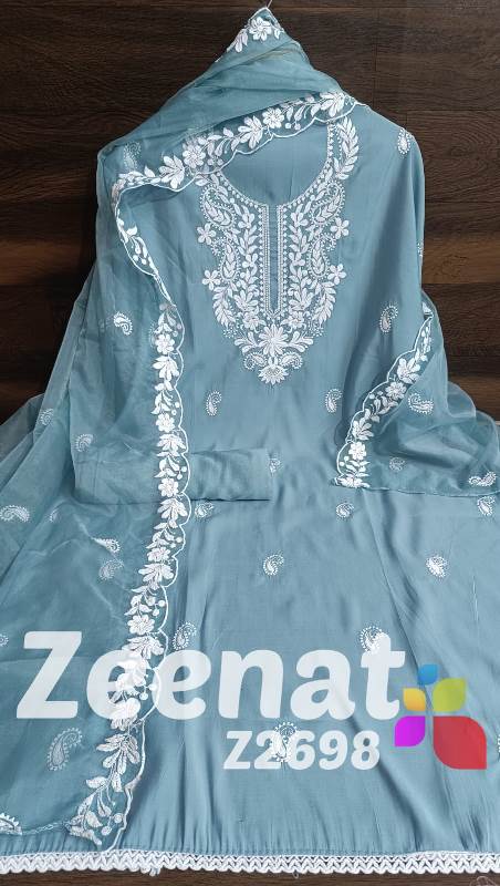 • NEW UPDATE Z2698 DESIGNER PC Details ? Shirt Modal maslin semi stich designer piece With all over beautiful embroidery work ?Bust 56 ?Length 47 ?Bottom reyon fabric 2.5 M ? organza dupatta with beautifull embroidery cutwork border Rate :: 1300 including shipping