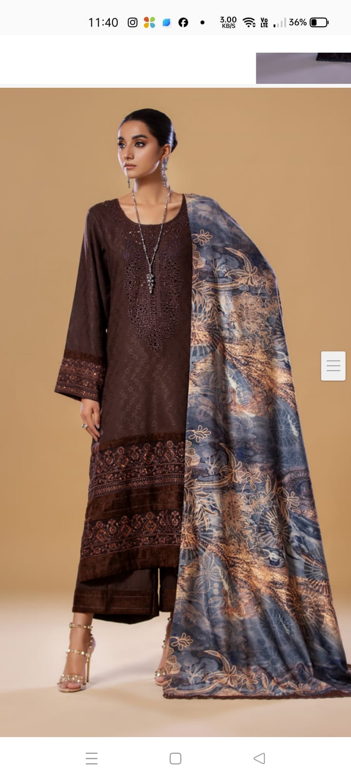 • RSP291 NEW UPDATE TEHZEEB Leather peach winter pakistani collection Description:- Top woolen shirt with embriodry neck n daman Bottom best quality woolen Dupatta Leather peach shawl with digital print Rate=2700 free shipping
