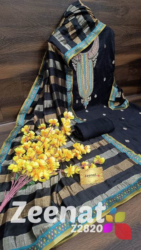 • NEW UPDATE Z2820 DESIGNER PC Details ?Shirt banarsi dola beautiful neck n daman viewing work unstitched designer piece ?Bust 60 ?Length 45 ?Bottom reyon fabric 2.5 M ?Dupatta pure soft organza with beautiful digital print all over work viewing border Rate :: 1400 including shipping