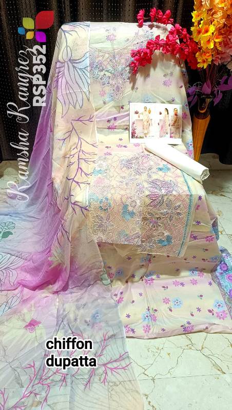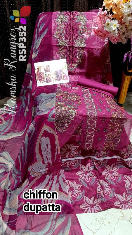• RAMSHA Rangrez Luxury Lawn Vol. 7 Fabric detail Shirt lawn with digital printed neck n daman embroidery Dupatta pure chiffon with digitel printed bemberg n silk Bottom plain n printed set price for personal message price 2500 free shipping