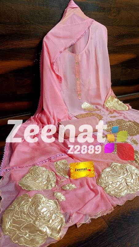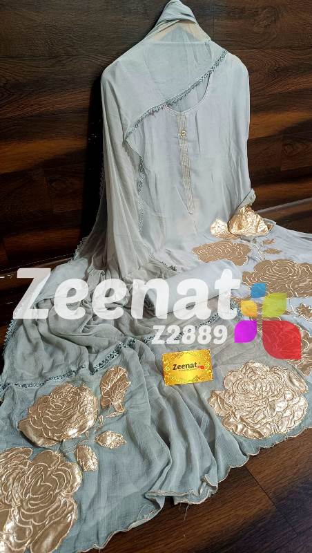 • NEW UPDATE Z2889 DESIGNER PC - BRIDAL ? Top organza unstitched with beautiful daman 3D embroidery cutwork...patches work...Bust 56 Length 46 ? Bottom reyon.....2.5 mtr aprox ? Dupatta chiffon with beautiful 3d embroidery cutwork pathes..2.25 mtr approx Very Very beautiful n exclusive design from ZEENAT ? ? Quality ZEENAT Assured ? ? 1500 including shipping