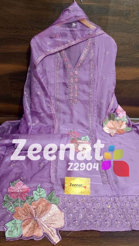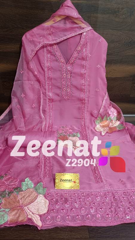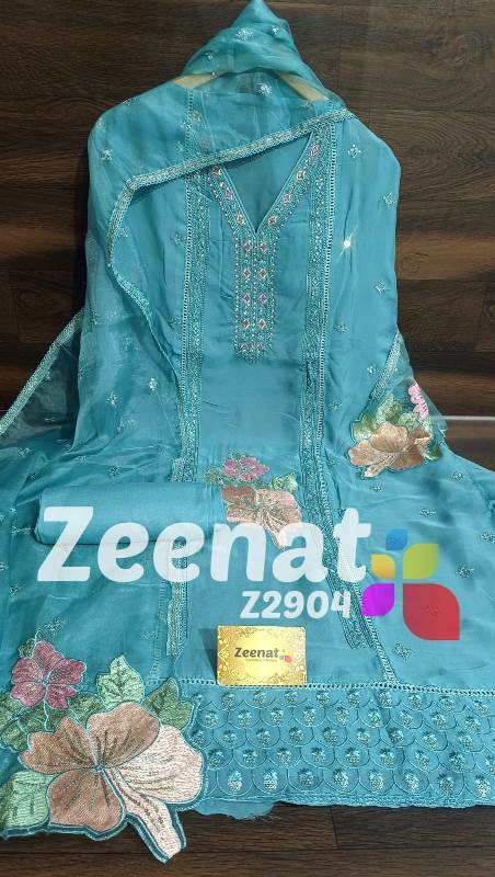 • *NEW UPDATE* *Z2904* *DESIGNER PC* ? Top pure organza unstitched with beautifull neck handwork n daman heavy embroidery n pathes daman .. ..Bust 60 Length 46 ? Bottom reyon ...2.5 mtr approx ? Dupatta pure organza with beautifull embroidery n embriodry pathes.2.25 mtr approx Very Very beautiful n exclusive design from ZEENAT ? ? Very Very cool fabric ? Quality ZEENAT Assured ? ? *1550 including shipping*