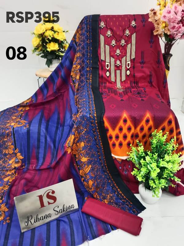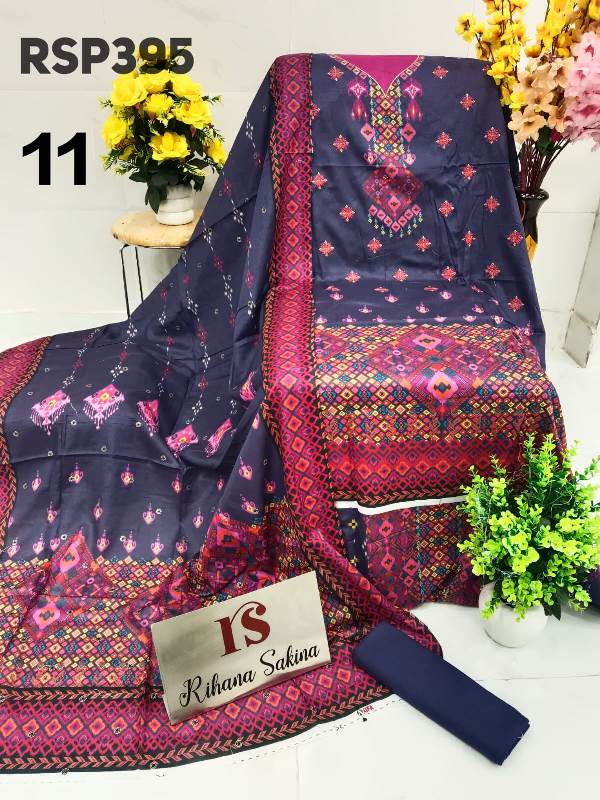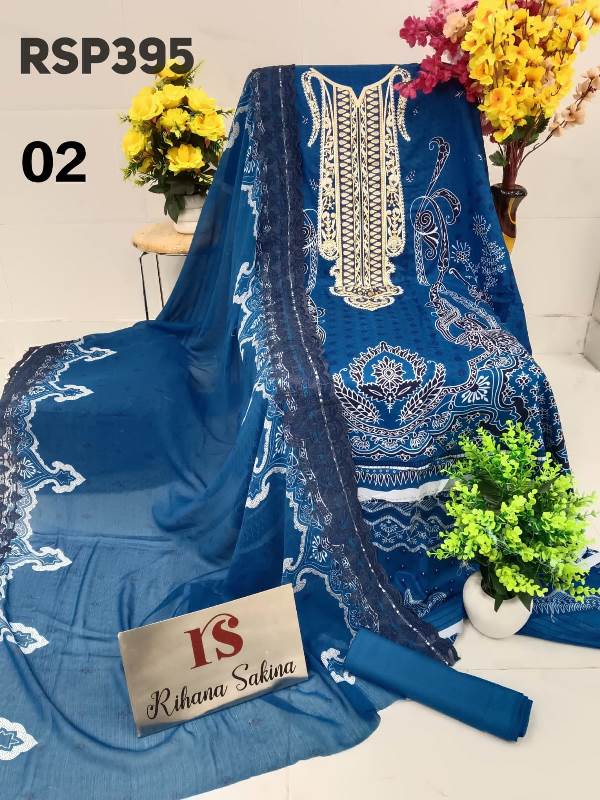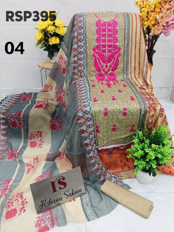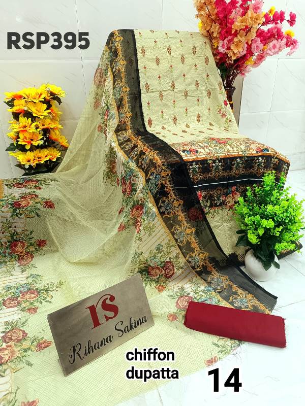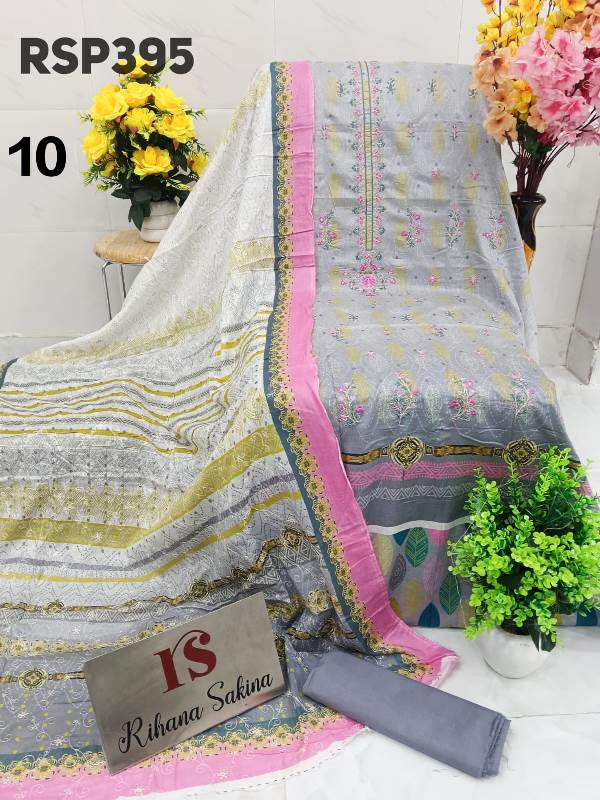 • RSP395 ?? New Update?? Pakistani luxury lawn embroidered 3 piece suit with chiffon cutwork embroidery dupatta Description:- ? Shirt digital lawn with neck embroidery fabric 3meter ? Dupatta digital print chiffon with cutwork embroidery border Or lawn dupatta 2.25 meter ? Bottom fabric plane 2.5 meter Fabric detail:- Lawn Best quality lawn ?Maximum design ?pick & choose Rate : 1650 free shipping