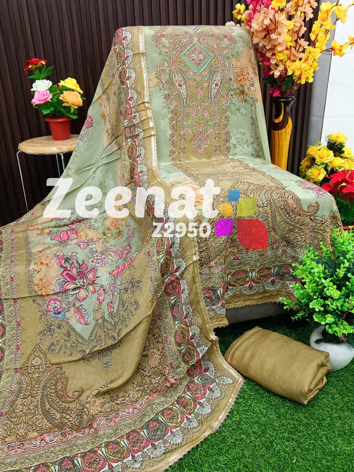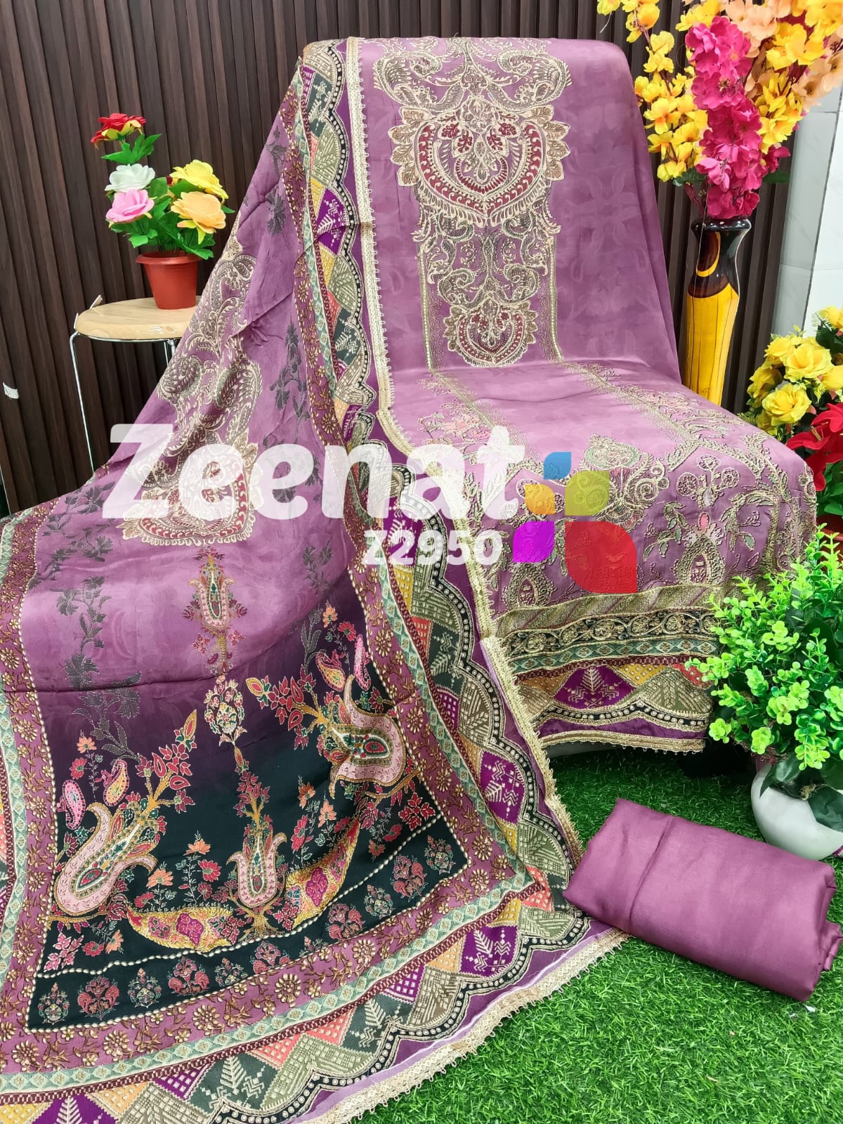 • NEW UPDATE Z2950 DESIGNER PC- BRIDAL ? Shirt Crepe unstitched with beautiful digital print n Zari n sequence heavy embroidery work .bust 58, Length 45 ? Bottom shantoon....2.5 mtr approx ? Dupatta pure chiffon with beautiful digital print n mirror work ....2.25 mtr approx Buy Original ZEENAT ? Quality ZEENAT Assured ? ? 2100 including shipping