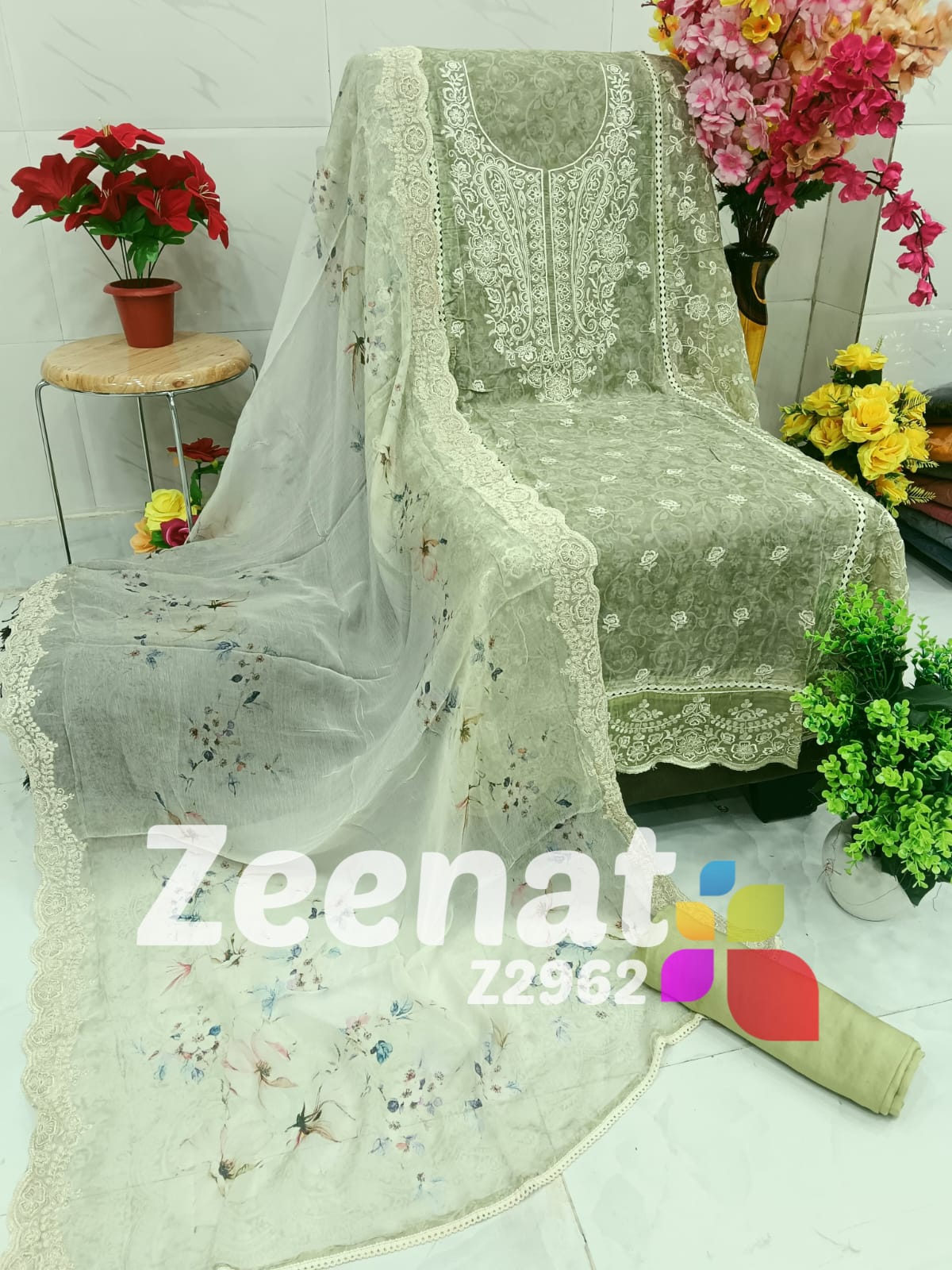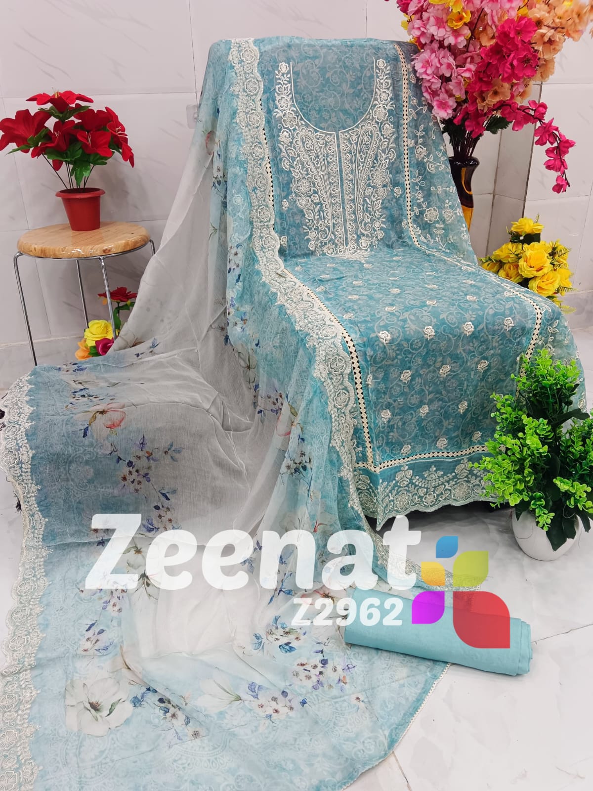 • NEW UPDATE Z2962 DESIGNER PC ? Top organza unstitched with beautiful digital print n embroidery neck n daman work...length 46...bust 60 approx ? Bottom shantoon fabric....2.5mtr approx ? Dupatta pure bemberg chiffon with beautiful digital print n cutwork embroidery...2.25 mtr approx Very Very beautiful n exclusive design from ZEENAT ? ? Super quality ? ? 1750 including shipping