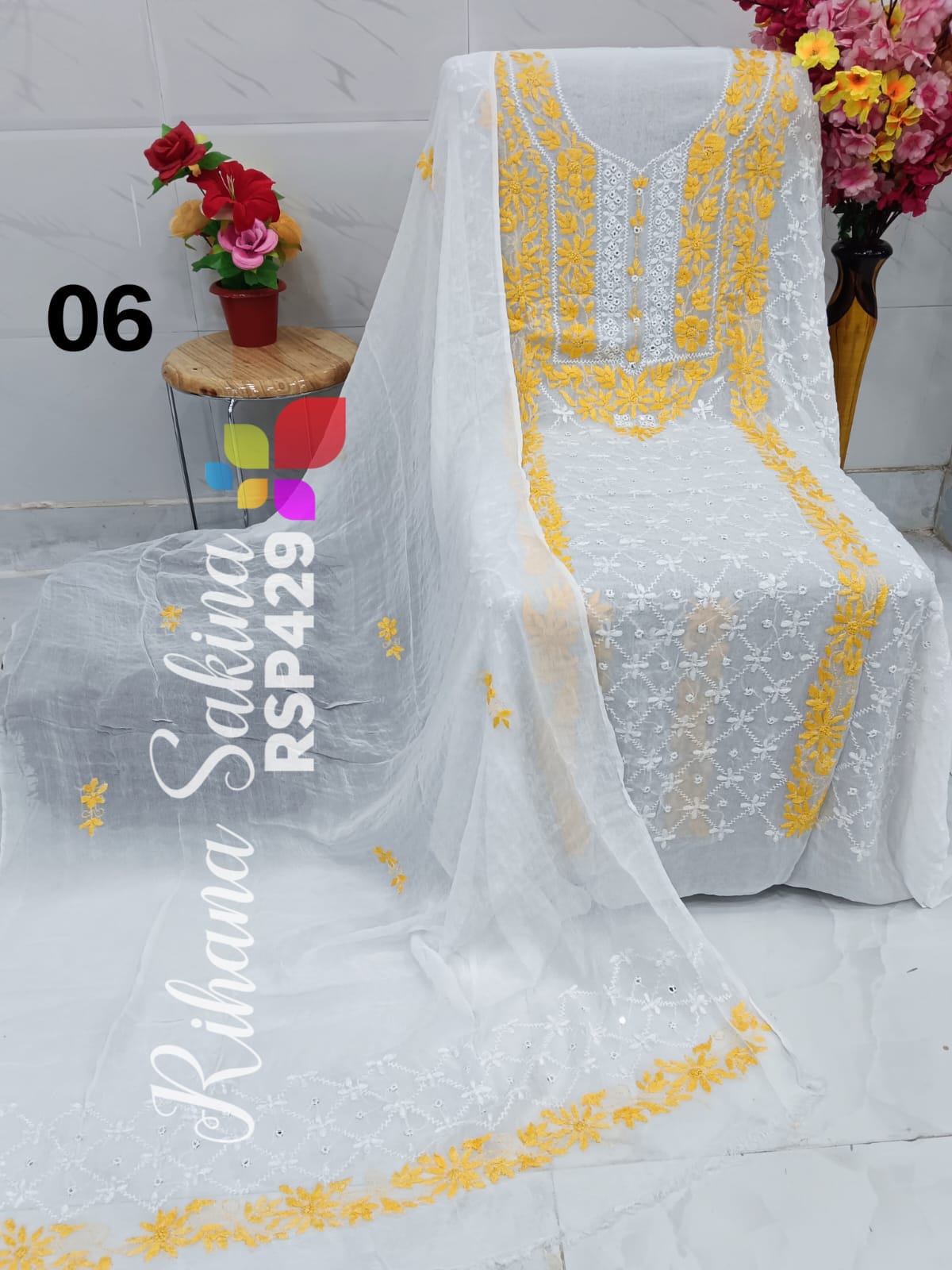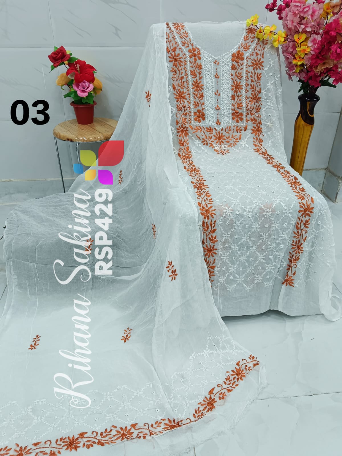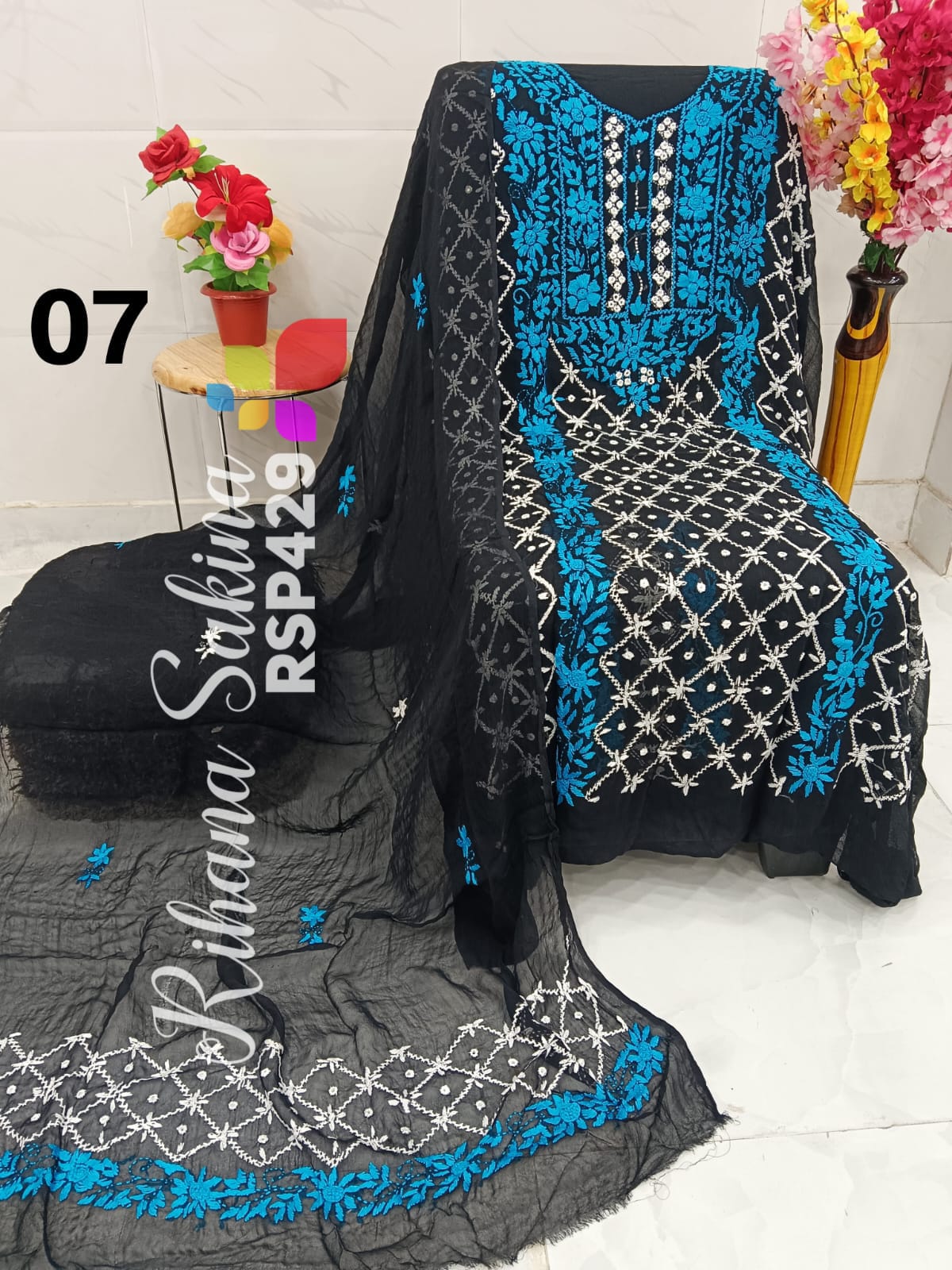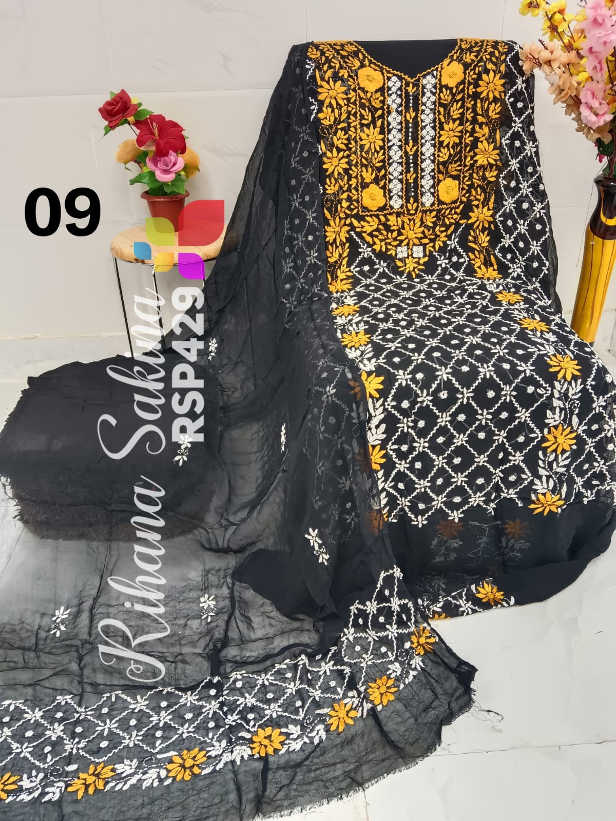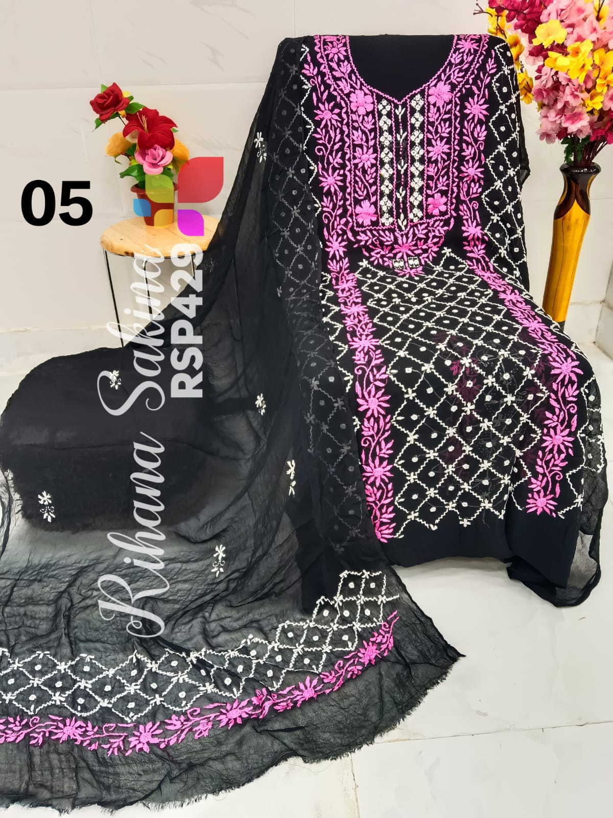 • RSP429 New Update Benazeer heavy embroidery Handmade suits Only Shirt dupatta Description:- Shirt embroidered by all handmade with fully heavy embroidery Length 46 Bust 52 Dupatta embroidered with booti n border. A class famous work. Very good quality. Fabric detail:- pakistani chiffon Price ::—1300 free shipping