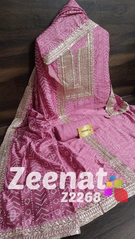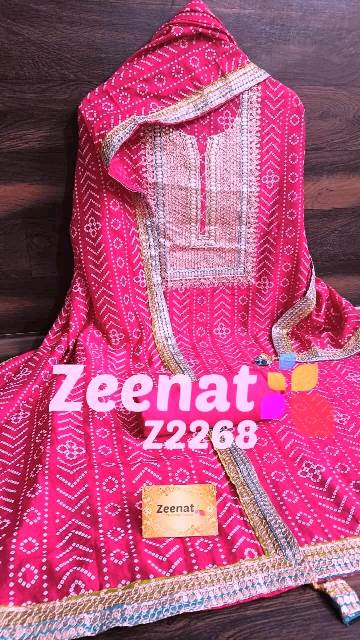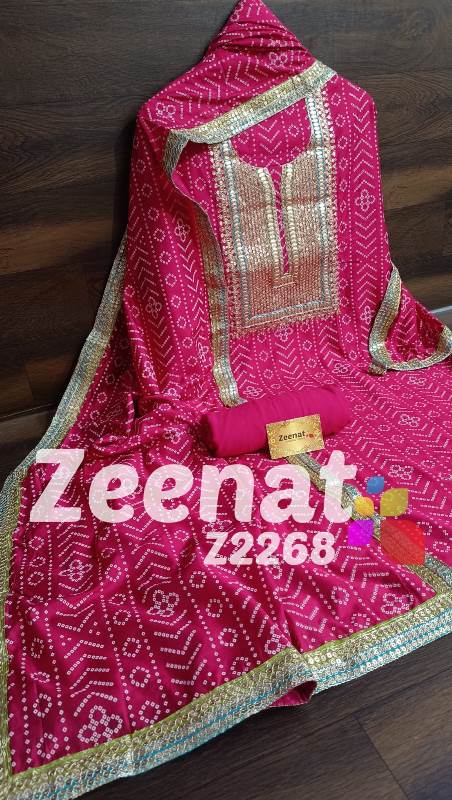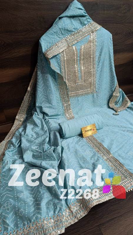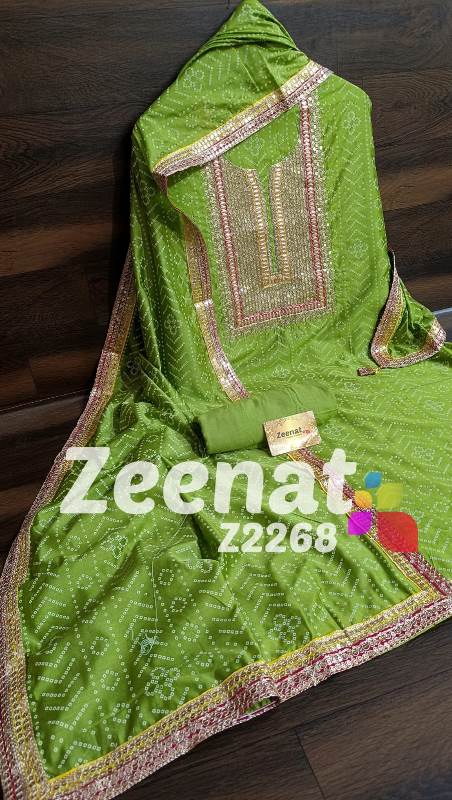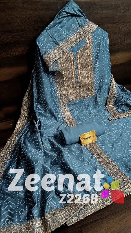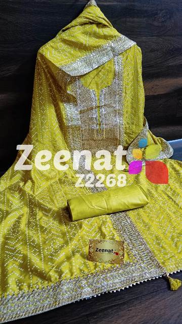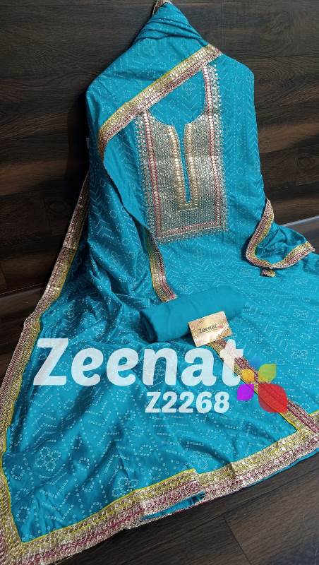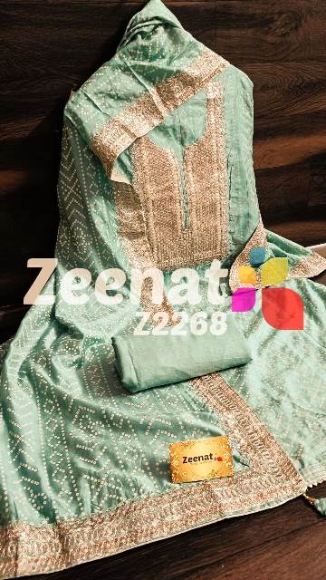 • New Update Z2268 Designer Piece ? Shirt Modal designer un-stitched with beautiful neck embroidery zari sequence and gota work and ....bust 48, Length 46 ? Pure shantoon bottom 2.5 mtr approx ? Dupatta modal silk with with gota and zari and sequence embroidery border Very Very beautiful n exclusive design from Zeenat ? ? Super quality ? ? 1400 including shipping