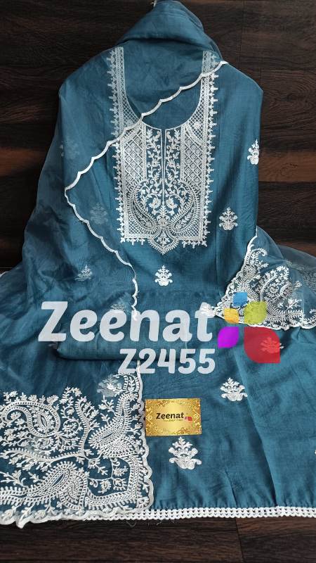 • NEW UPDATE Z2455 DESIGNER PC ? Shirt modal muslin designer semi-stitched with beautiful neck embroidery daman lace..bust 58, Length 46 ? Bottom reyon.....2.5 mtr approx ? Dupatta ORGANZA with beautiful 4 side embroidery border....2.25 mtr approx Buy Original ZEENAT ? Quality ZEENAT Assured ? ? 1400 including shipping